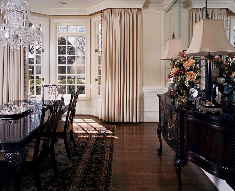 | “Elegant” describes this dining room furnished in classic style with Century furniture. The custom floral arrangement reflects the colors in the oriental rug. |