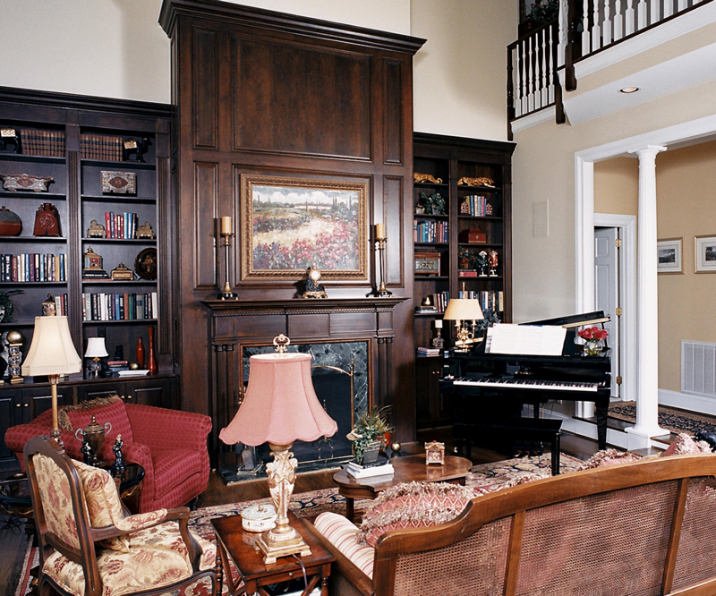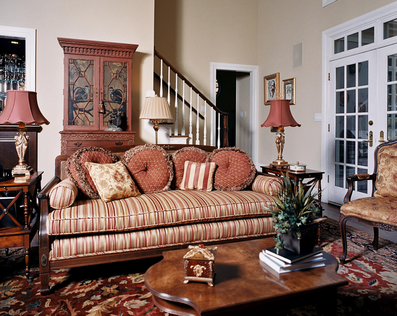| The living room of this beautiful Morrocroft home is graced with Ann’s mother’s sofa, a handsome cane-backed antique. Ann remembered it being upholstered in a velvet stripe when she was young. I found this fabric of mustard and deep rust tone velvet stripes and, as you can see in the lower picture, mixed it with a diamond pattern, a larger stripe and a beautiful jacquard that Ann found. Lush trims added to the mix. We also used the jacquard on two small chairs. This room was a true collaboration between clients and designer. As Ann would say “We’d find something we liked and tell Tandy to make it work and she would!” Lots of accessories were added to the bookcases. |