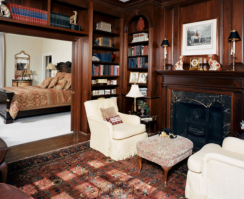 | The library and master bedroom provide a cozy sanctuary at the end of the day. Favorite chairs were recovered in lemony chenille, an accent color taken from the rug. The bookcases, like the ones in the living room, were again a fun project using my clients accessories and books and a couple of carloads of additional pieces. |