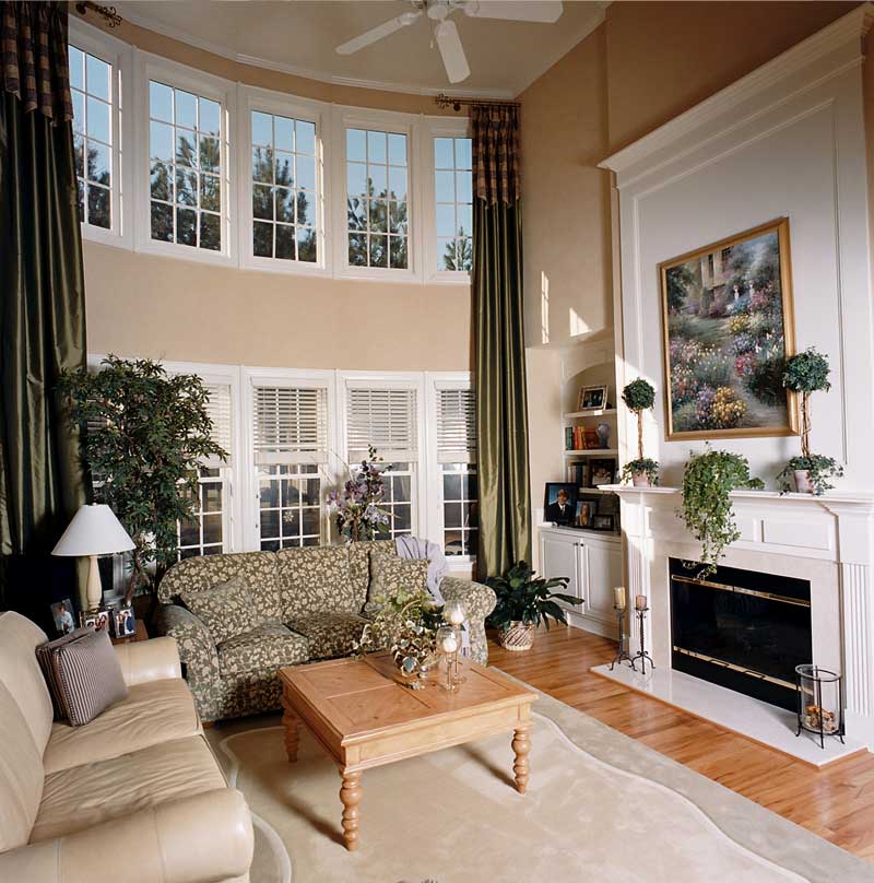 | High walls of windows can be daunting or spectacular. We went for spectacular! The custom-designed rug accents the floor and creates the traffic flow. |