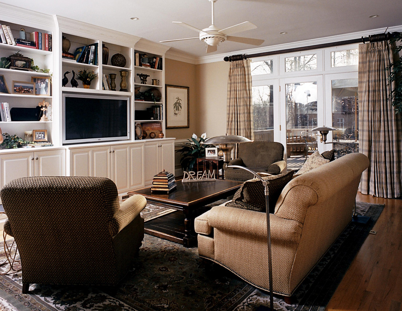 I have had the opportunity of working with Lynn and Jim for about 8 years, one project at a time.  There was only one major area left – the two story high living room.  A neighbor’s transition of a similar space into two rooms stacked one upon the other inspired this active family to do the same creating a media/family room on the main level with the kids’ retreat upstairs.  After helping Lynn with trim and paint colors, I found a beautiful rug they liked and it became the starting point for the selection of fabrics and comfortable seating.  Accessories were a combination of several pieces that Lynn had, family pictures and several carloads I brought in along with unique floor lamps and a fabulous coffee table I found.  I arranged the accessories and their books in the bookcases and completed the room with a few finishing touches.